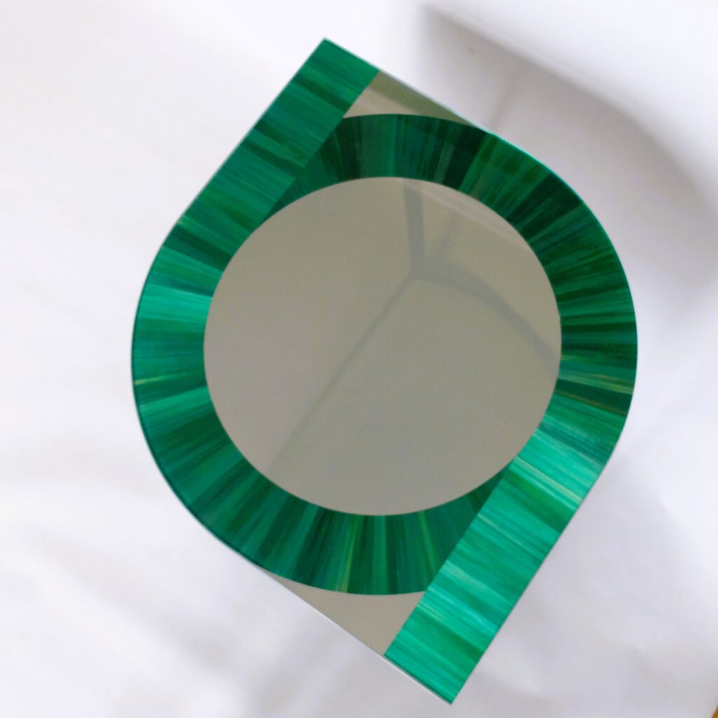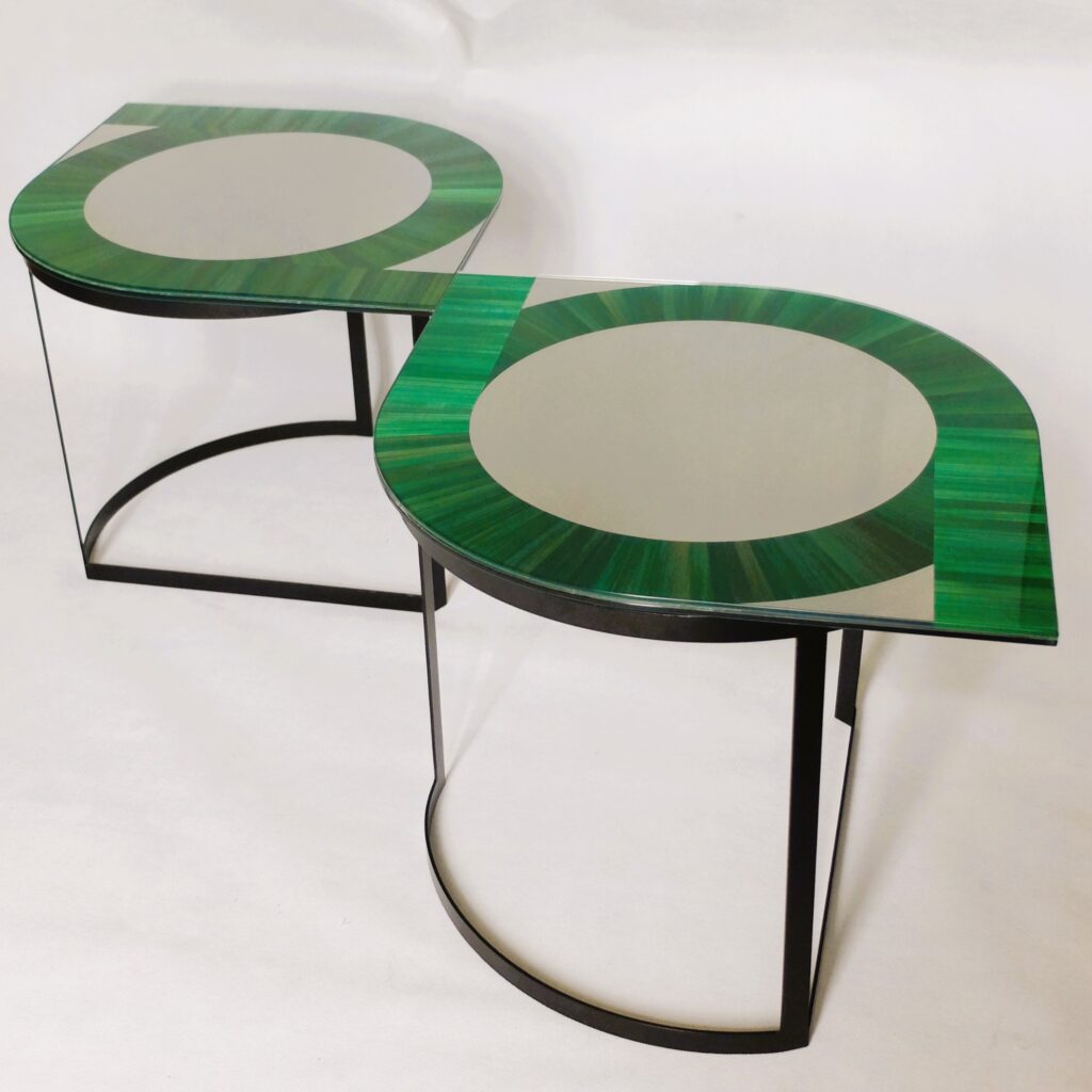 Les guéridons Garden Party sont une évocation des parterres des jardins à la française.          Le motif de la marqueterie de paille verte sur fond miroir  se répond symétriquement d’un guéridon à l’autre. Parfaits pour encadrer un meuble ou un passage, ils fonctionnent également seuls ou peuvent être alignés pour former une table basse.