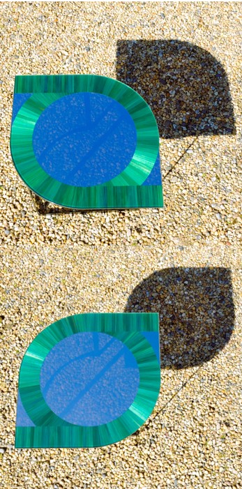 Le panneau de verre feuilleté de marqueterie de paille rend cette dernière pérenne, elle est protégée de la décoloration, de l’humidité, du frottement et du décollement. Grâce à ce procédé la marqueterie de paille peut être pensée pour de nouveaux usages. Ces guéridons peuvent ainsi être installés en extérieur.