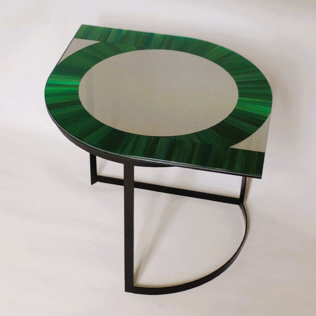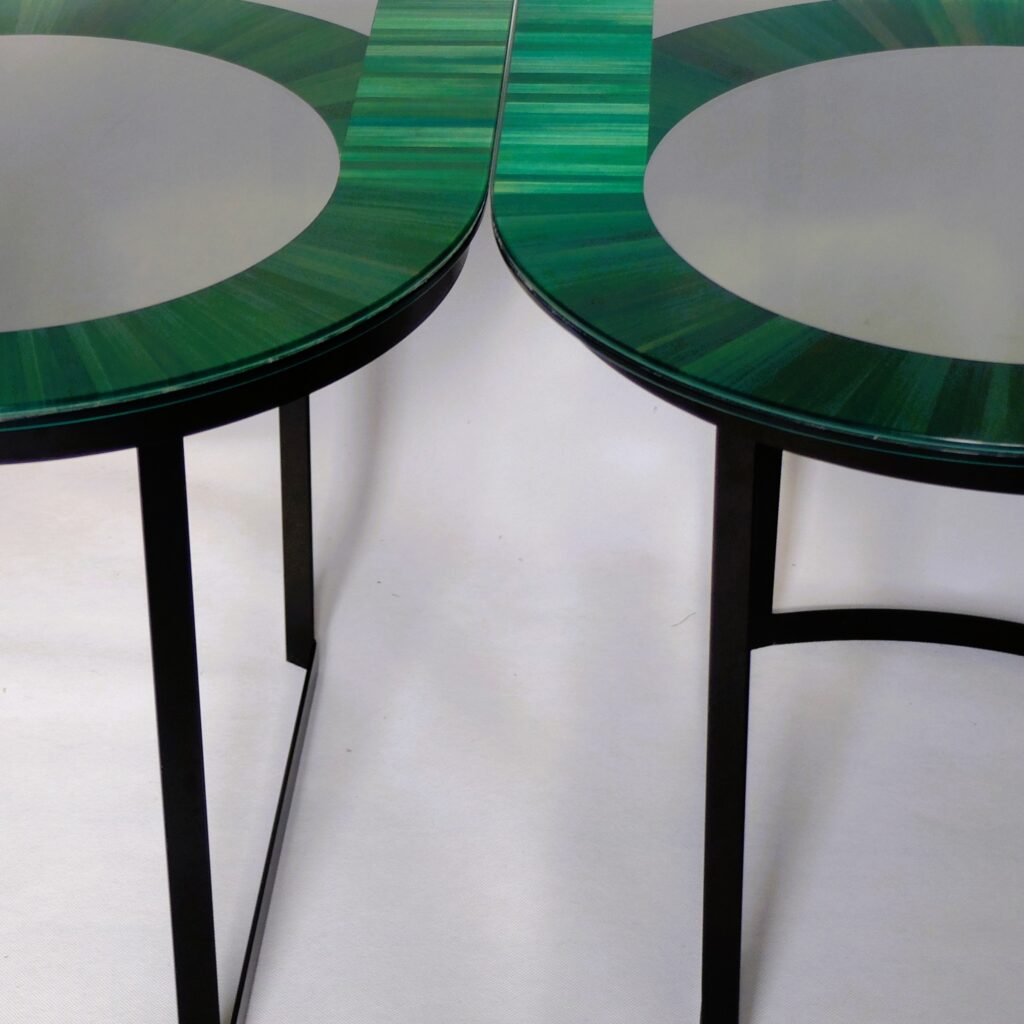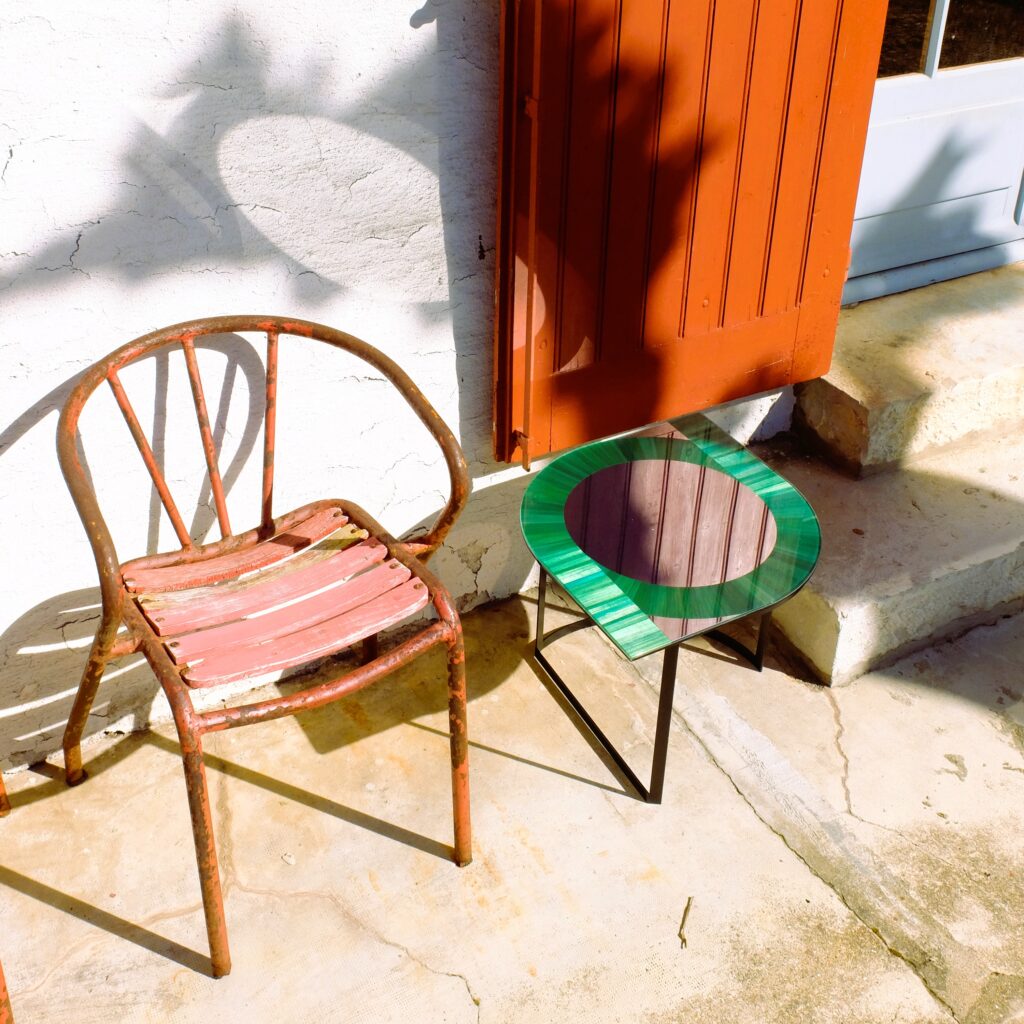 Outre leur esthétique particulière, la gamme de meubles “Garden Party” est la première application concrète de  marqueterie de paille fixée sous-verre.