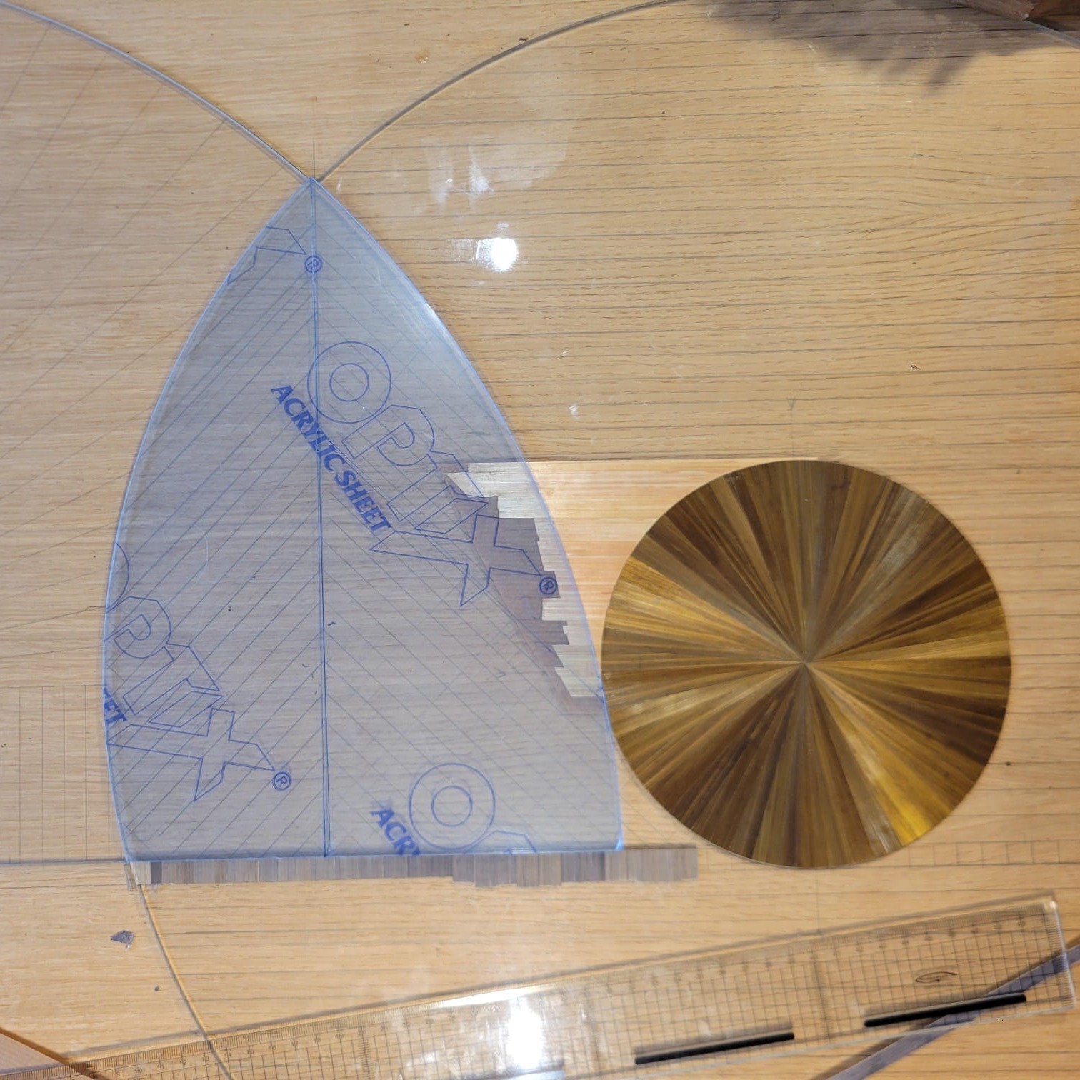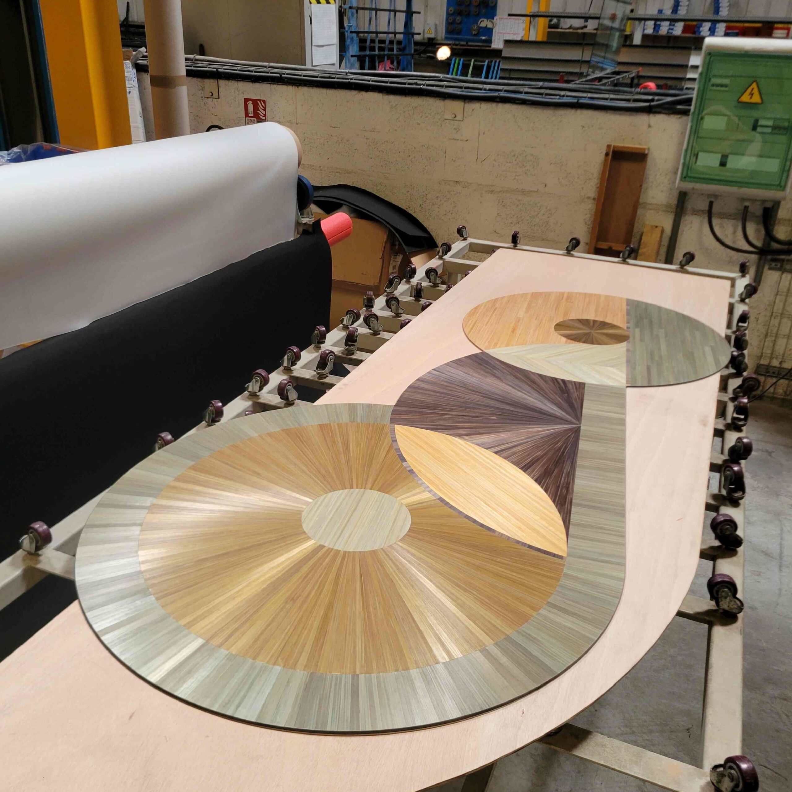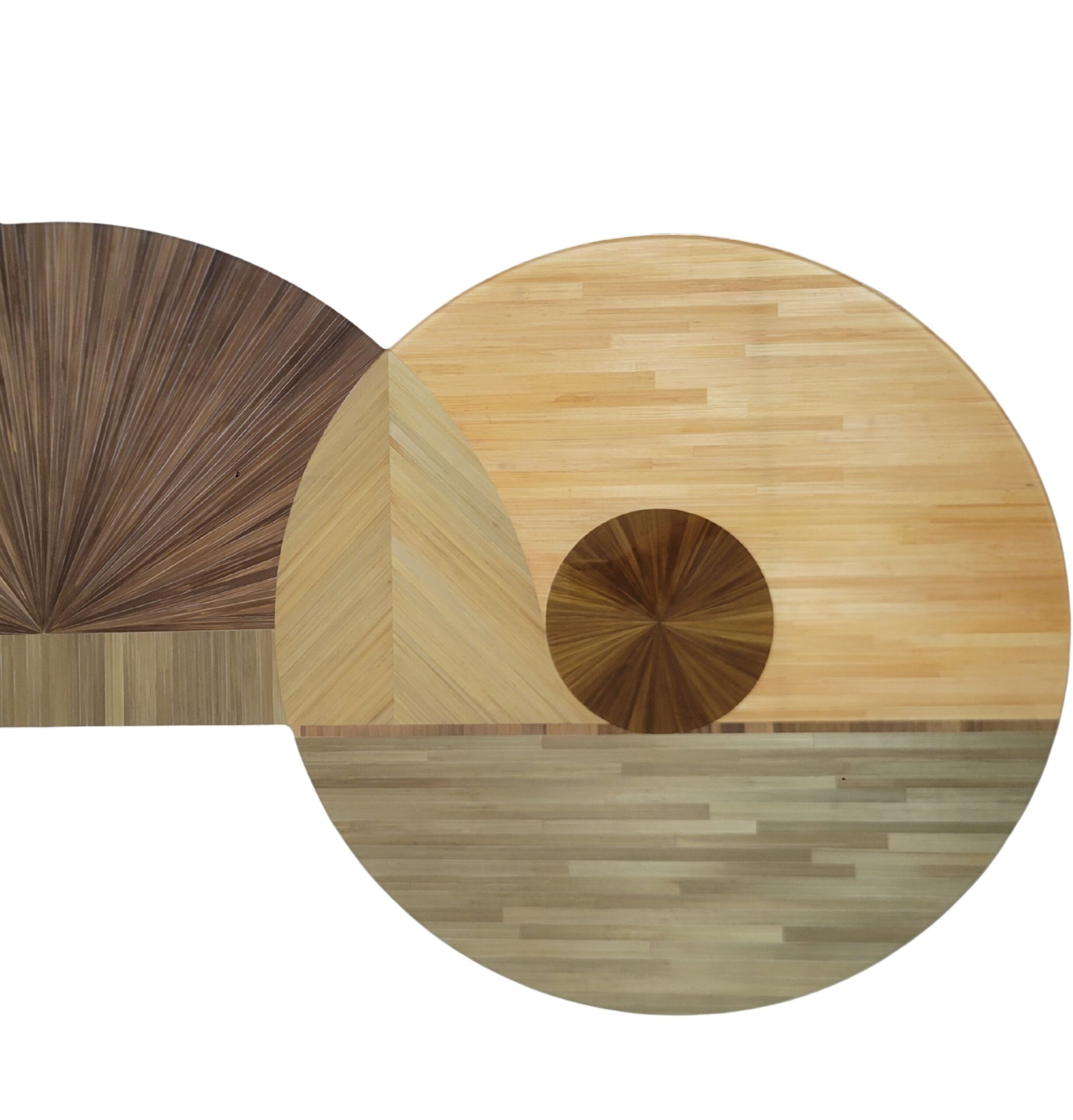 La table basse Champagne est un fixé sous verre de pailles, 8 coloris marquetés en pailles droites, chevrons, éventails et soleils.